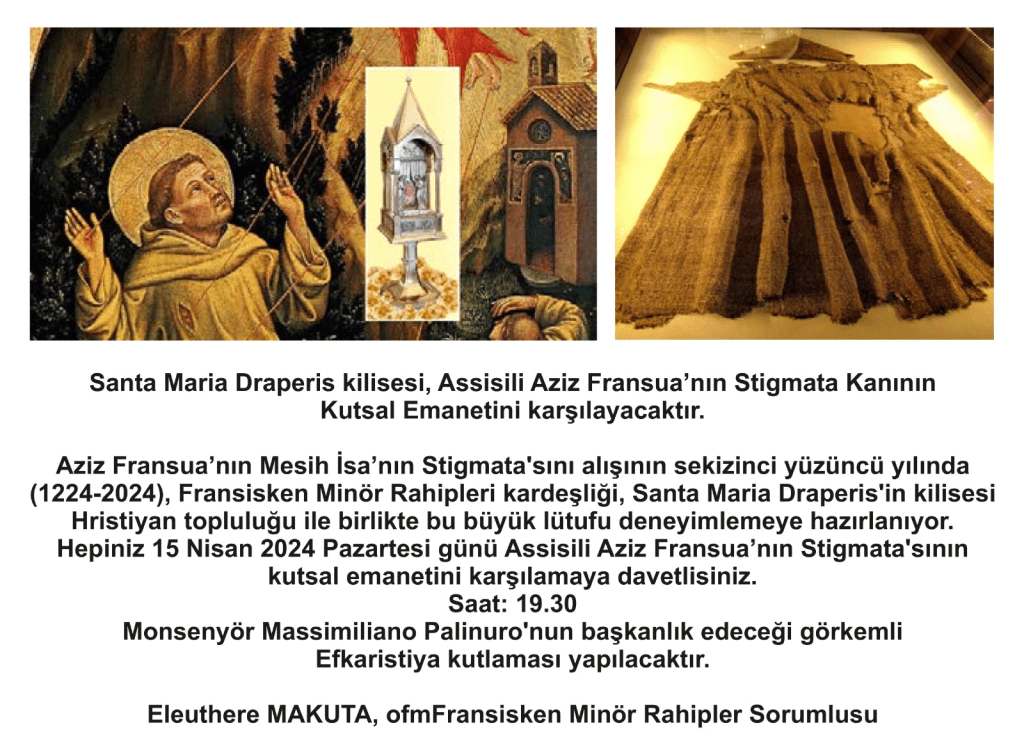Tören ve Kutsal Ayin , Assisili Aziz Fransua’nın Stigmata Kanının Kutsal Emaneti karşılanacak.