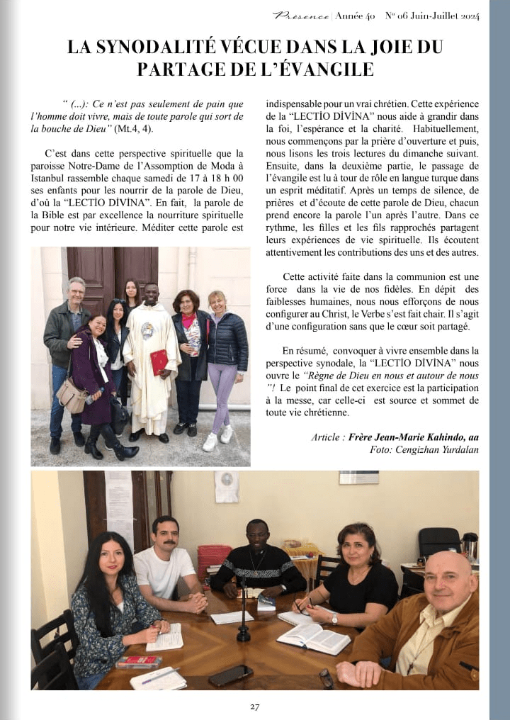 Bu ruhani bakış açısıyla İstanbul Moda’daki Notre-Dame de l’Assomption Kilisesi, çocuklarını Tanrı’nın sözüyle beslemek için her Cumartesi saat 17:00-18:00 arasında bir araya getiriyor ve buna “LECTIO DIVINA” diyor. Aslında, İncil’in sözü, içsel yaşamımız için mükemmel bir ruhsal gıdadır. Bu sözü düşünmek, gerçek bir Hristiyan için vazgeçilmezdir. Bu “LECTIO DIVINA” deneyimi, iman, umut ve sevgide büyümemize yardımcı olur. Genellikle açılış duasıyla başlıyoruz ve ardından bir sonraki Pazar gününün üç okumasını yapıyoruz. Daha sonra, ikinci bölümde, İncil’den bir pasaj meditasyon ruhuyla sırayla Türkçe olarak okunur. Bu Tanrı’nın sözünü dinleme, dua ve sessizlikten sonra, her birimiz sırayla tekrar söz alırız. Bu ritimde, kızlar ve oğullar, ruhsal yaşam deneyimlerini paylaşırlar. Herkes birbirinin katkılarını dikkatle dinler.